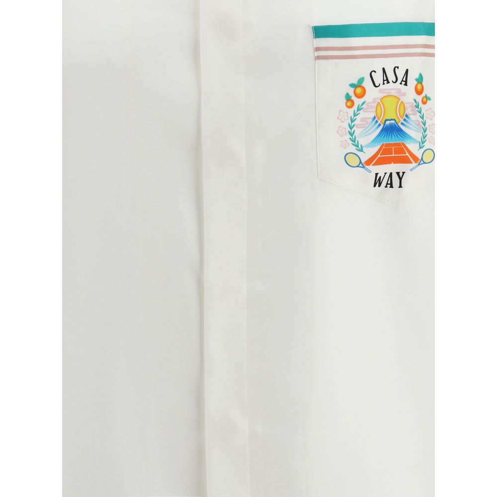 Casablanca’s short-sleeved silk The Casa Way Shirt is a printed design featuring the house’s iconic graphics inspired by nature, architecture and tennis. Made of fine silk twill, it is completed with a Cuban collar, concealed front button closure, CC woven logo corozo buttons, and striped piping on the collar, cuffs, and hem.