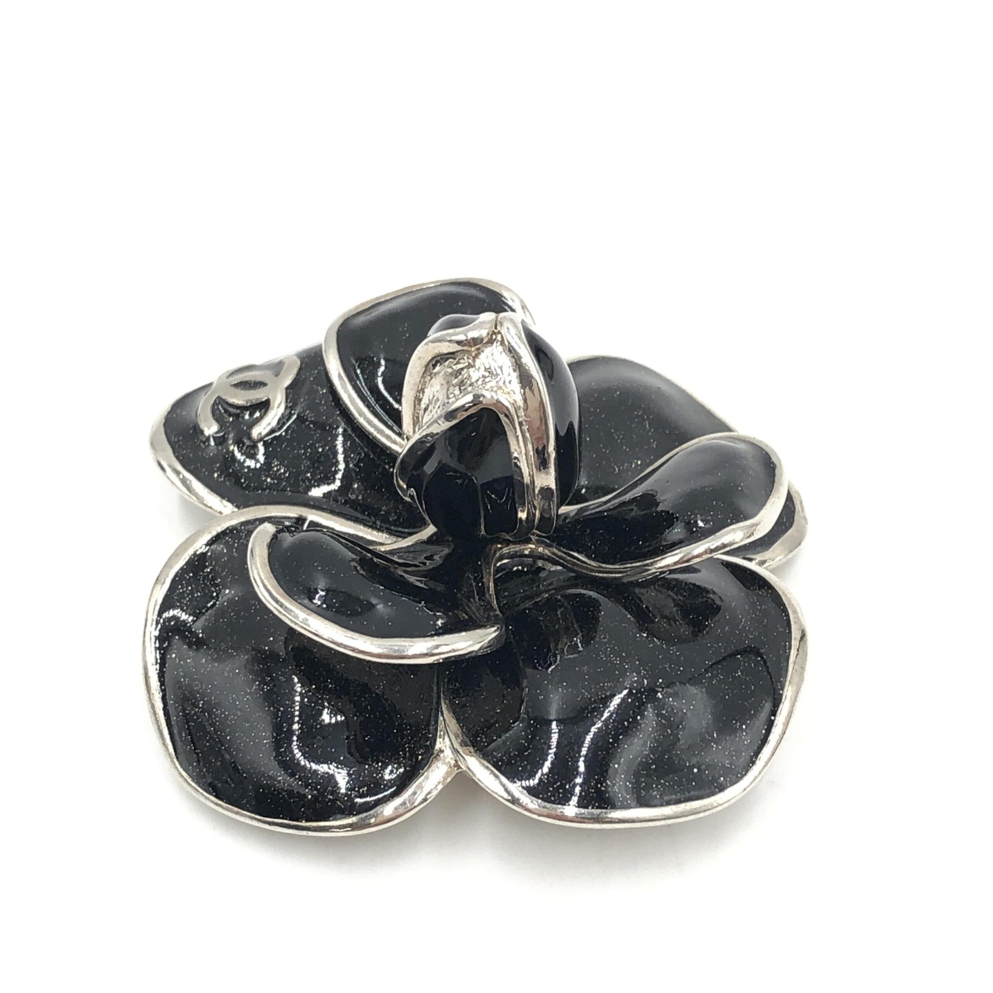 Chanel Black Enamel Flower Brooch With Silver-Tone