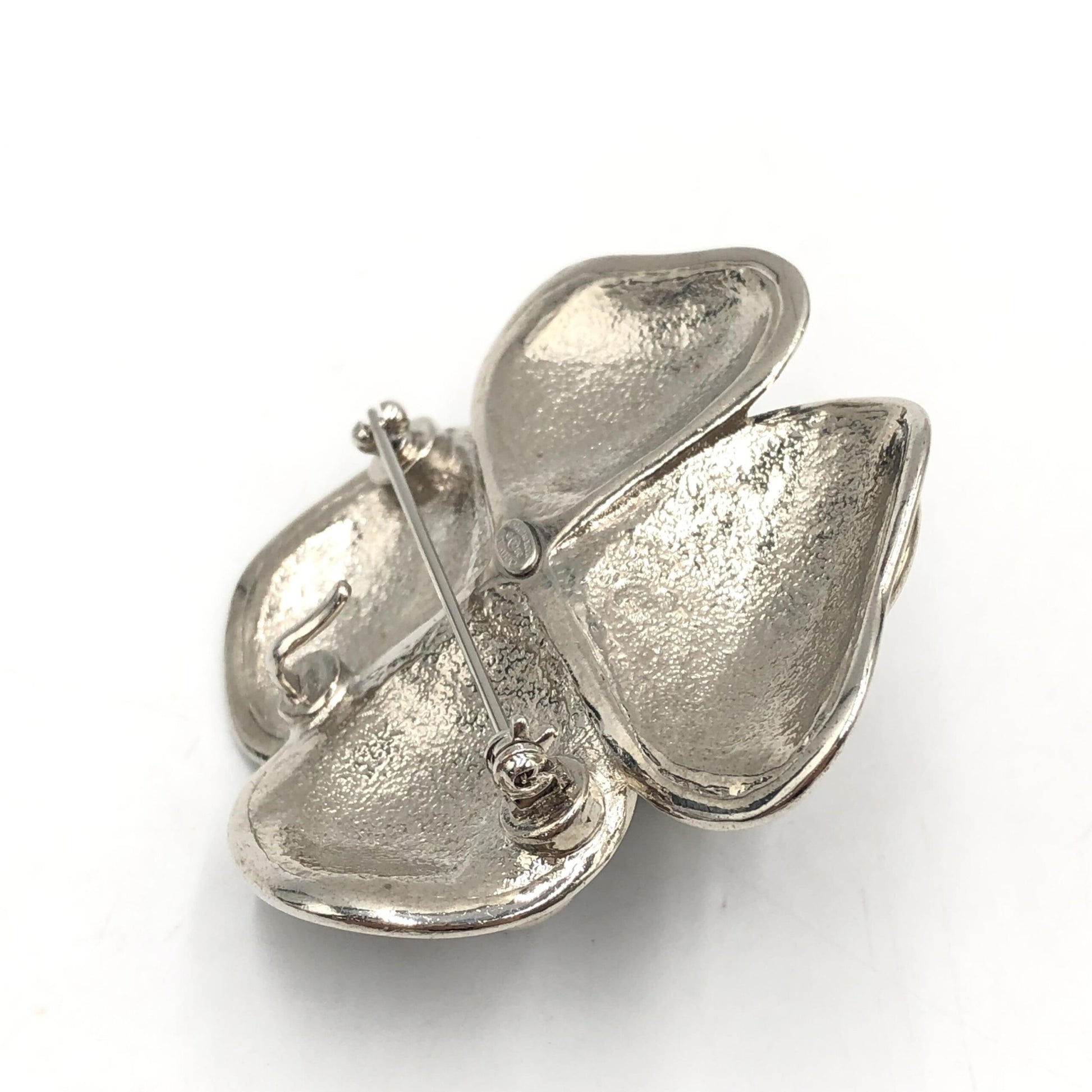 The brooch features a captivating black enamel flower design, beautifully contrasted by a lustrous silver-tone finish. This harmonious blend of materials creates a striking visual appeal, perfect for elevating any ensemble, whether pinned to a chic blazer or an elegant evening gown.