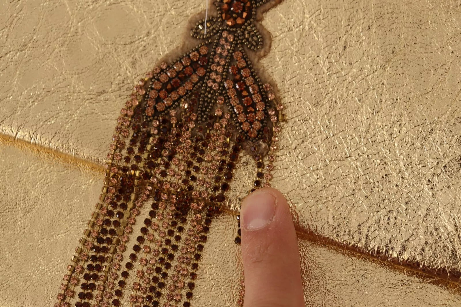 This item has a defect, there are missing chains of crystals in the front decoration (see pictures for details).