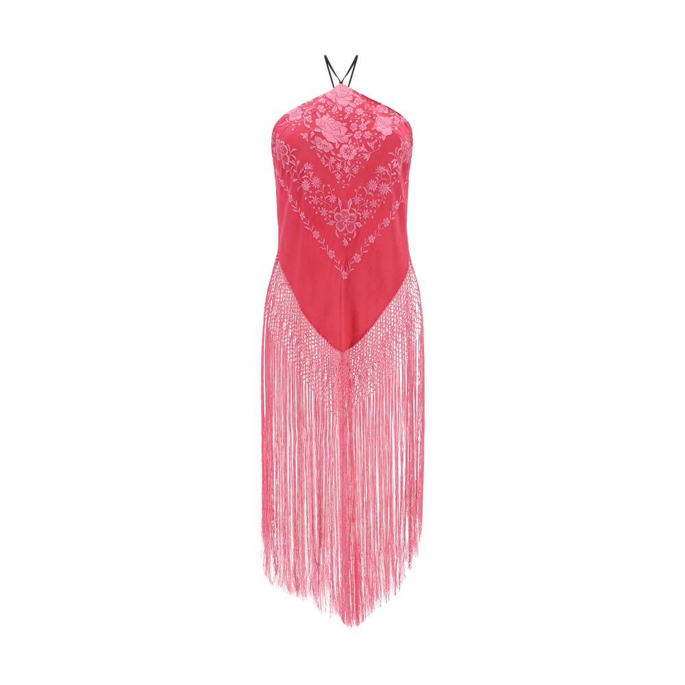 Seidenschal-Pianotop von Conner Ives, schulterfreies Design, amerikanischer Ausschnitt vorne, lange Fransenapplikation am oberen Saum, asymmetrischer Saum, gesticktes Blumenmuster vorne und hinten.