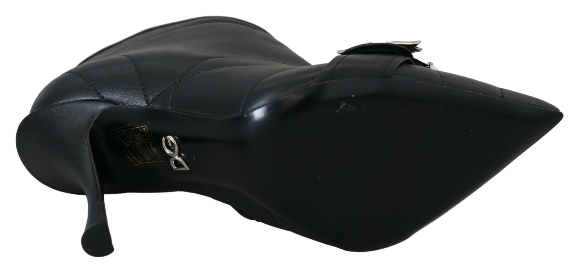 Wunderschön, brandneu mit Etikett. 100 % authentisch. Dolce & Gabbana strahlen sizilianische Eleganz aus und lassen sich vom alltäglichen italienischen Lebensstil inspirieren, wie diese schwarzen, gesteppten Lederstiefeletten mit Schnalle. Mit spitzer Zehenpartie, seitlichem Reißverschluss, Marken-Innensohle und hohem Stilettoabsatz.