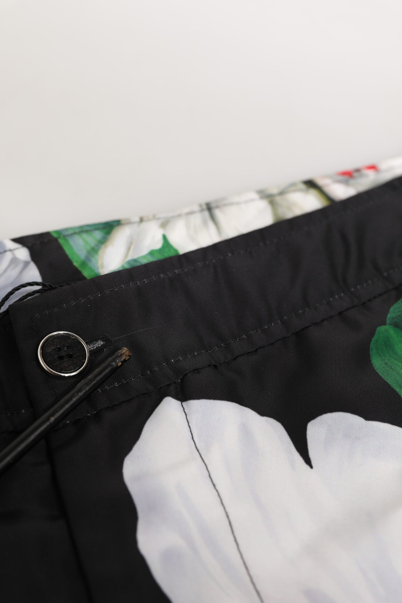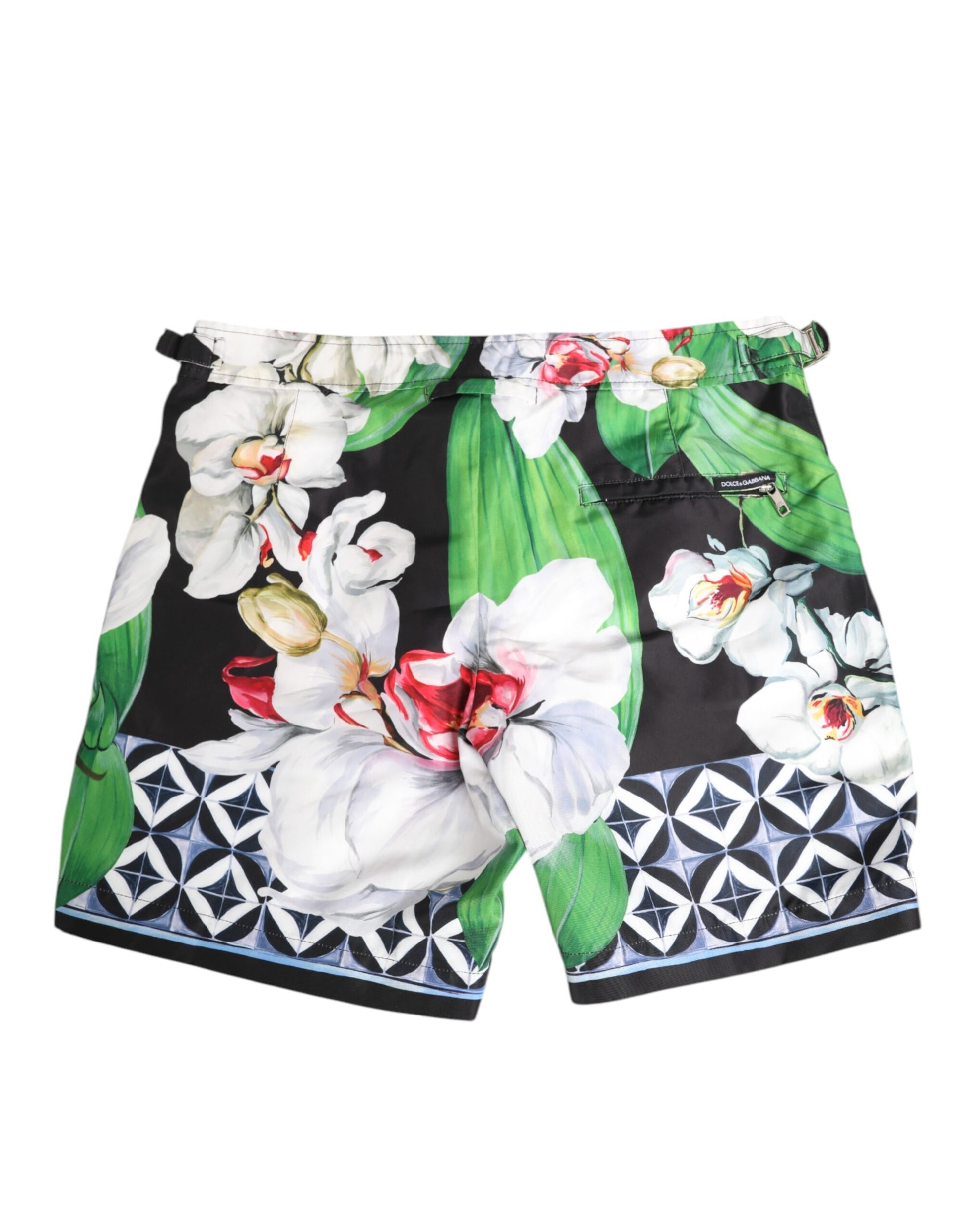 Wunderschöne, brandneue, 100 % authentische Dolce & Gabbana-Bermudashorts mit Blumenmuster. Hergestellt in Italien aus hochwertigem, leichtem Stoff mit einem leuchtenden Orchideen-Blumenmuster in Weiß-, Grün- und Rottönen auf schwarzem Grund mit geometrischen Details. Der verstellbare Bund mit seitlichen Schnallen sorgt für einen sicheren Sitz und einen klassisch-geschnittenen Stil.
