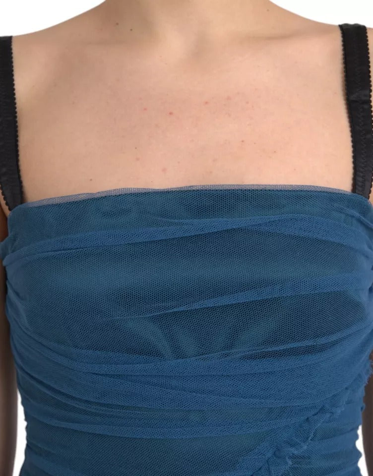 Wunderschönes, 100 % authentisches, ärmelloses, figurbetontes Midikleid aus gerüschtem Tüll in Blau von Dolce & Gabbana.