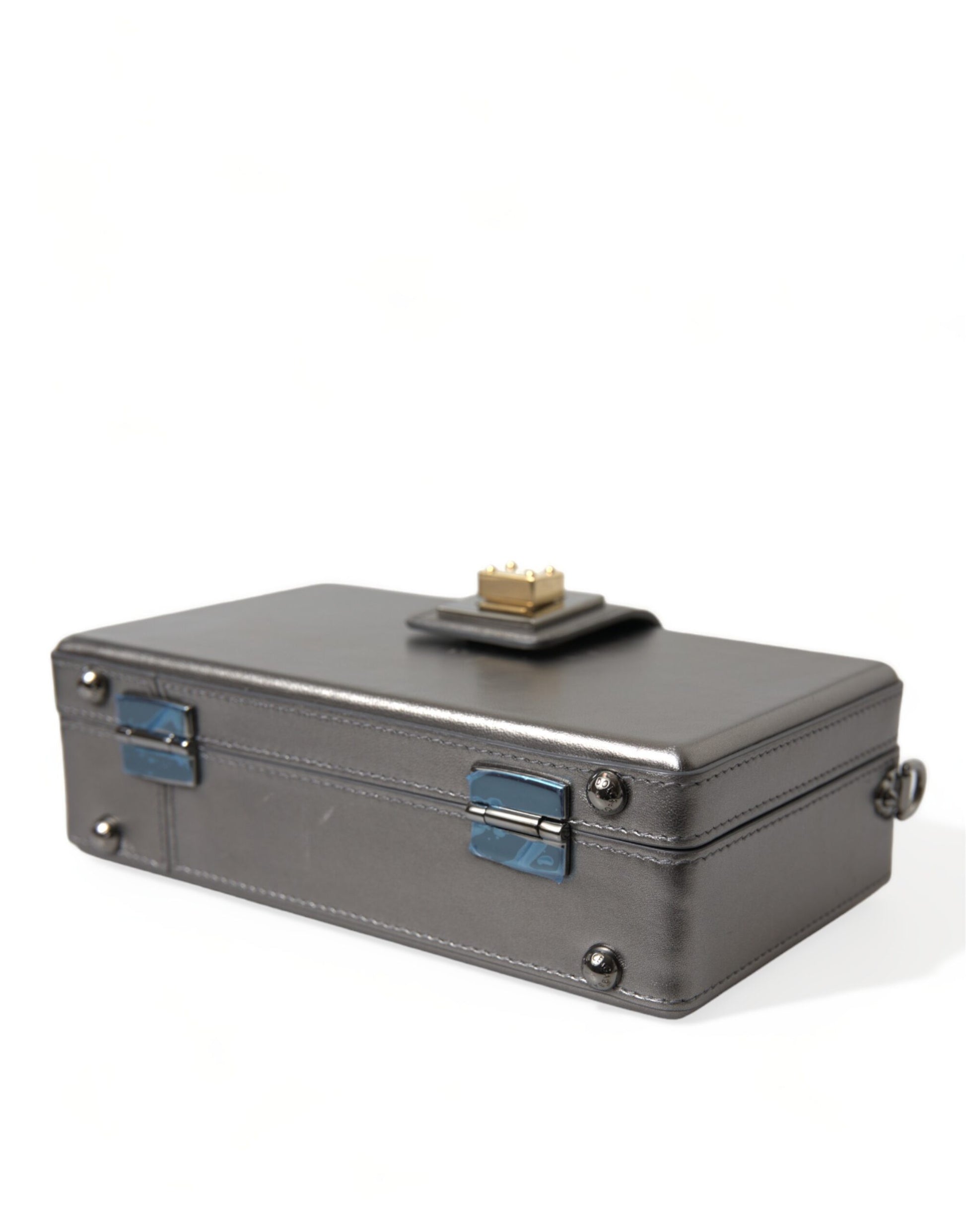 Wunderschöne gebrauchte, 100 % authentische Dolce & Gabbana-Umhängetasche in einem auffälligen Stahlgrauton. Das strukturierte, kastenförmige Design aus hochwertigem Leder wird durch polierte goldfarbene Beschläge und einen Druckverschluss mit eingraviertem Logo für eine raffinierte Note akzentuiert.