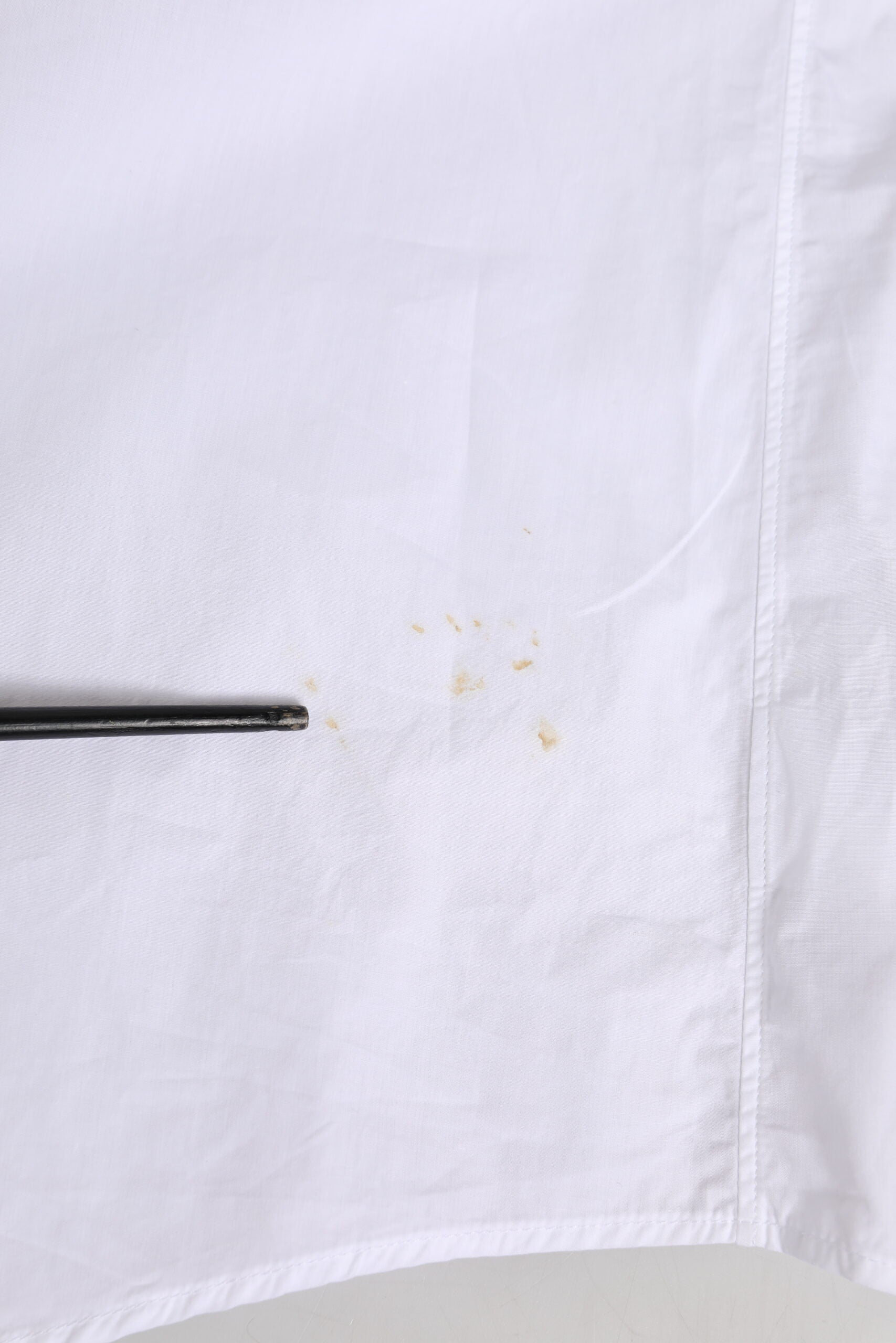 Dieser Artikel weist einen kleinen Defekt auf: Es gibt Flecken um das Knopfloch am Kragen, Flecken auf der unteren Rückseite und Verfärbungen an der Manschette (Details siehe Bilder).