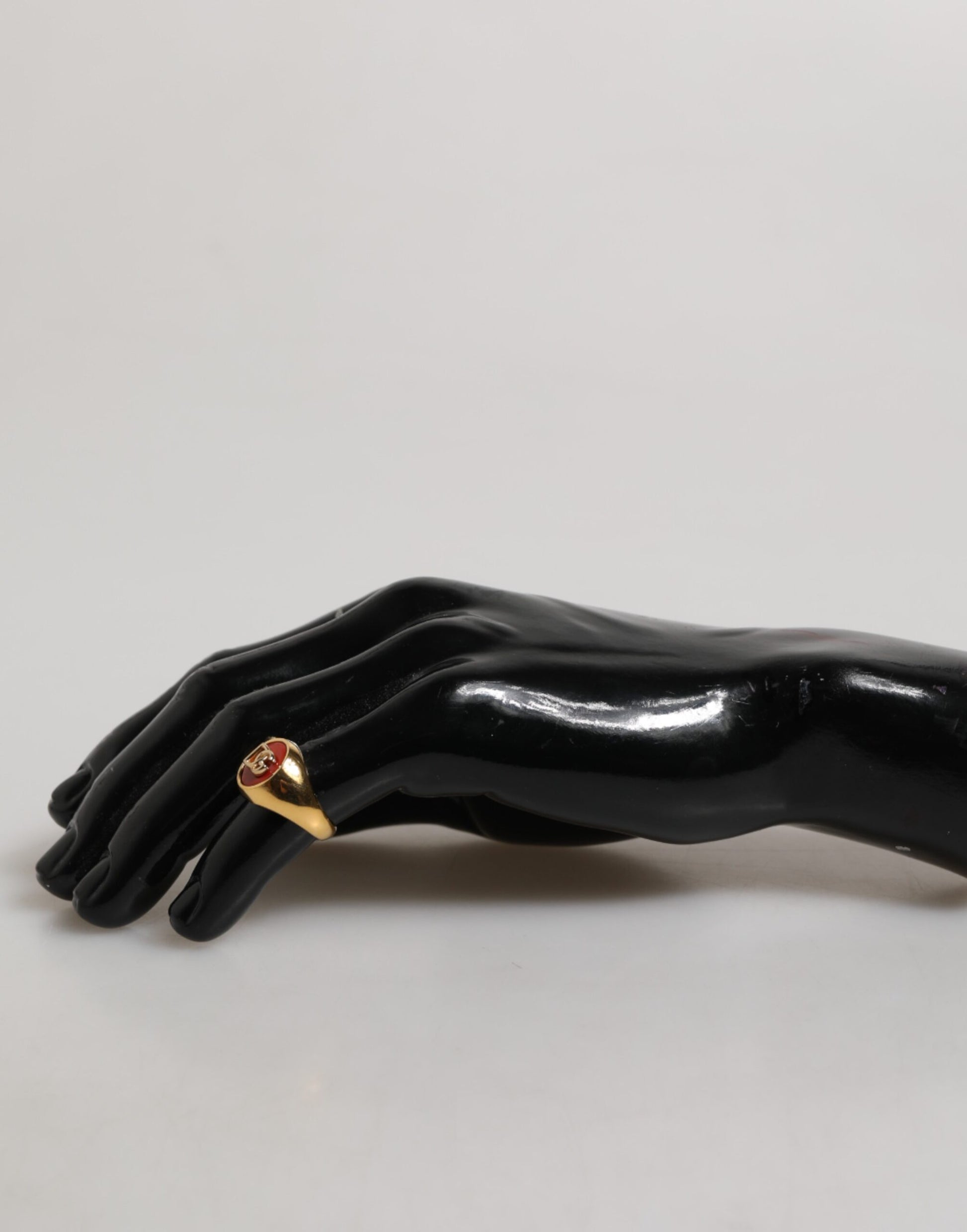 Das markante, runde Design aus goldfarbenem Echtmessing wird durch das markante rote Emaille-DG-Logo in der Mitte hervorgehoben. Dieser Statement-Ring vereint modernen Luxus mit charakteristischer Markenführung und ist ein Blickfang für jede stilvolle Garderobe.