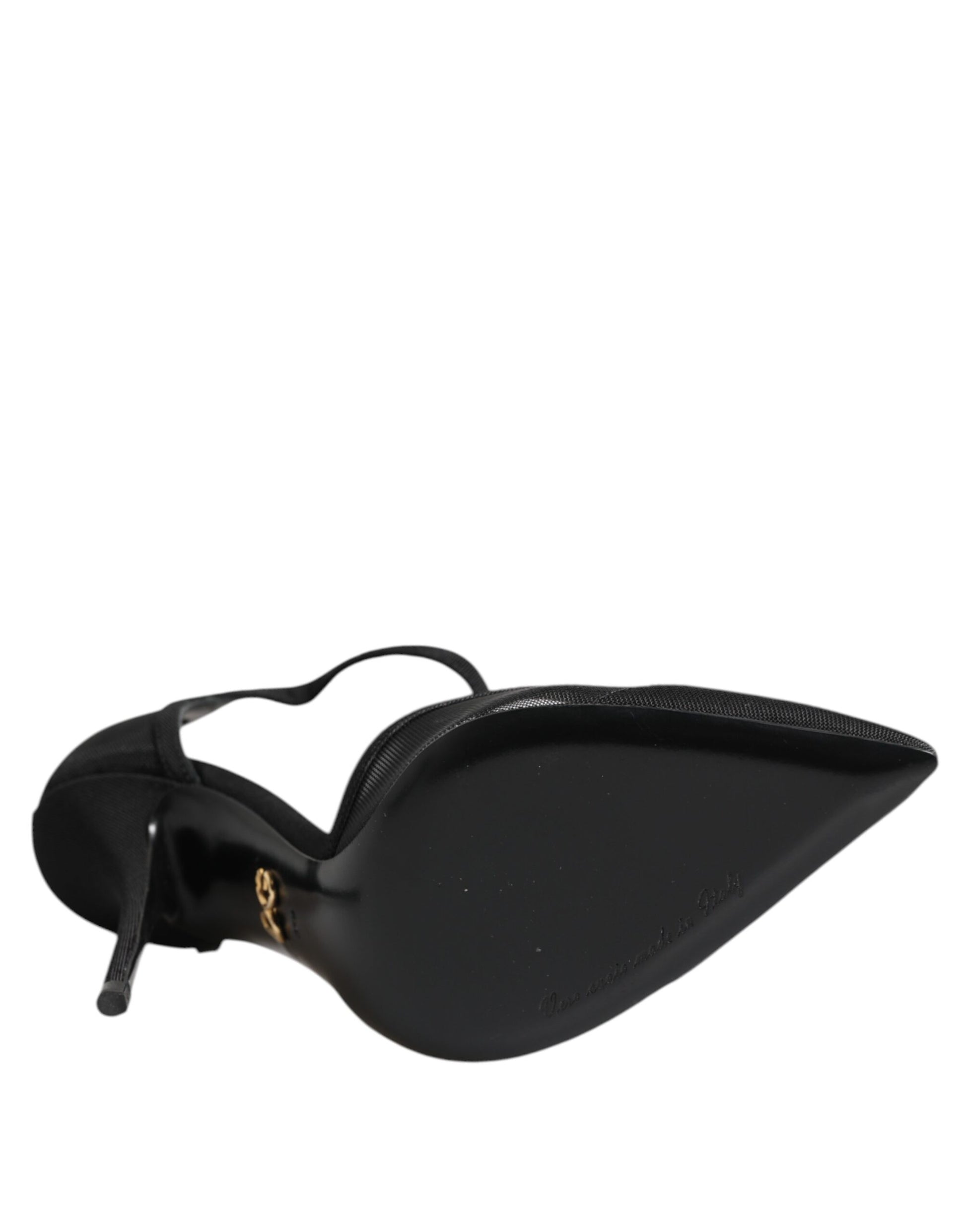 Wunderschöne, brandneue, 100 % authentische Schuhe von DOLCE & GABBANA mit schwarzem Mesh-Obermaterial, T-Riemen-Design, hohem Stilettoabsatz und mandelförmiger Zehenpartie. Modell: Sandalen mit Knöchelriemen Farbe: Schwarz Material: 69 % Nylon, 37 % Viskose Sohle: Leder Schnallenverschluss Logodetails Hergestellt in Italien Sehr exklusiv und hochwertig verarbeitet