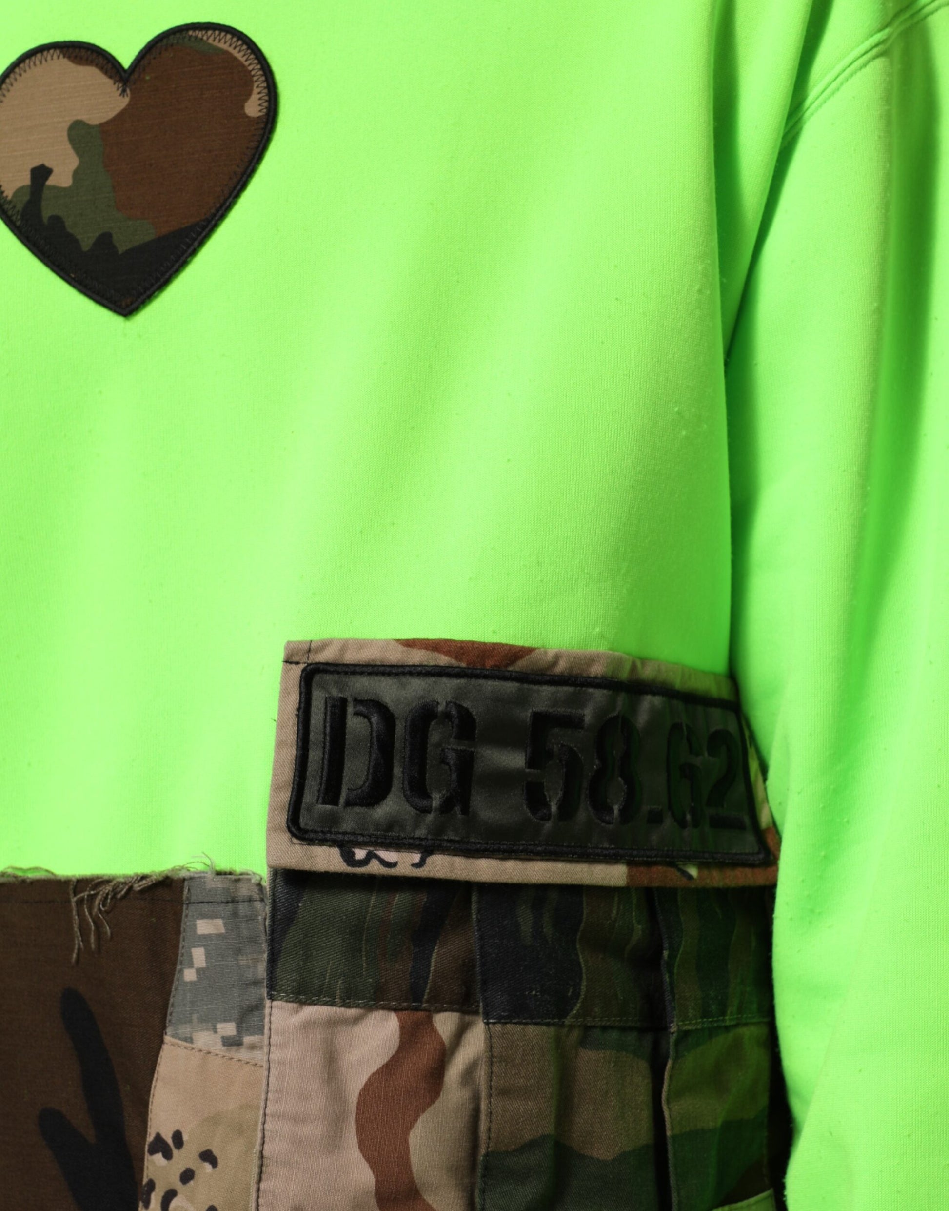 Wunderschönes gebrauchtes, 100 % authentisches Dolce & Gabbana Sweatshirt aus weicher grüner Baumwolle mit verspieltem Patchwork-Herzmotiv auf der Brust. Mit klassischem Rundhalsausschnitt, langen Ärmeln und gerippten Bündchen und Saum verbindet es lässigen Komfort mit typisch italienischem Stil – perfekt für gehobene Streetwear, Wochenendkleidung oder Lagenlooks für einen stilvollen, entspannten Look. Modell: Sweatshirt mit Rundhalsausschnitt Farbe: Grün Material: 20%CO+20%PA+60%PL Passform: Normale Passform Logodetails Hergestellt in Italien Sehr exklusiv und hochwertig verarbeitet